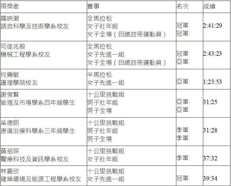 理大約2,300跑手奮戰各項賽事,更有七名健兒憑實力獲佳績,得獎詳情如下: