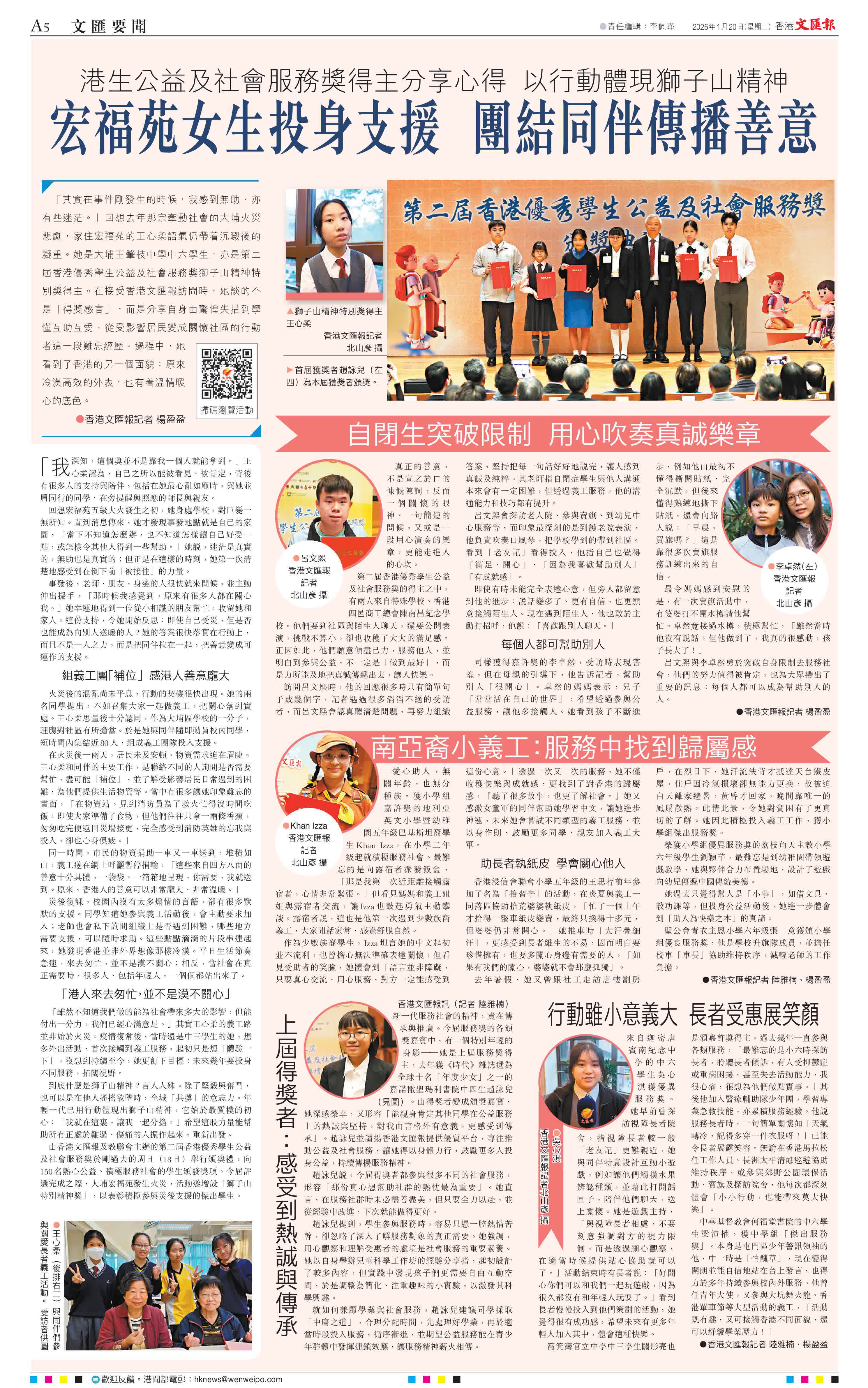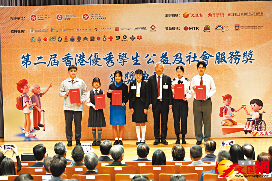 由香港文匯報及教聯會主辦的第二屆香港優秀學生公益及社會服務獎於剛過去的周日(18日)舉行頒獎禮,向150名熱心公益、積極服務社會的學生頒發獎項。今屆評選完成之際,大埔宏福苑發生火災,活動遂增設「獅子山特別精神獎」,以表彰積極參與災後支援的傑出學生。