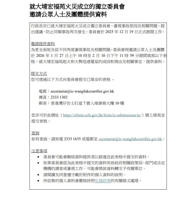 香港文匯報訊(記者 蕭景源)就大埔宏福苑火災成立的獨立委員會今日(26日)公布,邀請公眾人士和團體由明日(1月27日)起至2月10日,就起火和火勢迅速蔓延的成因和情由及相關事宜提供資料。