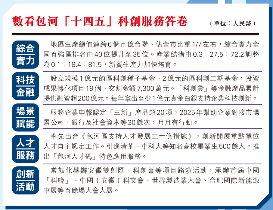 以科創集團所運營的中國視界園區為例,截至2025年底,園區累計註冊企業322家,總計招商企業103家,其中國家高企23家、省專精特新企業7家、國家級專精特新小巨人企業1家、規上企業8家。「引進來」更要「留得住」,包河科創集團完善對企全要素保障,以提供的全周期金融服務為例,僅2025年就協助熊儲能源、老聃科技等企業累計融資超2,000萬元。