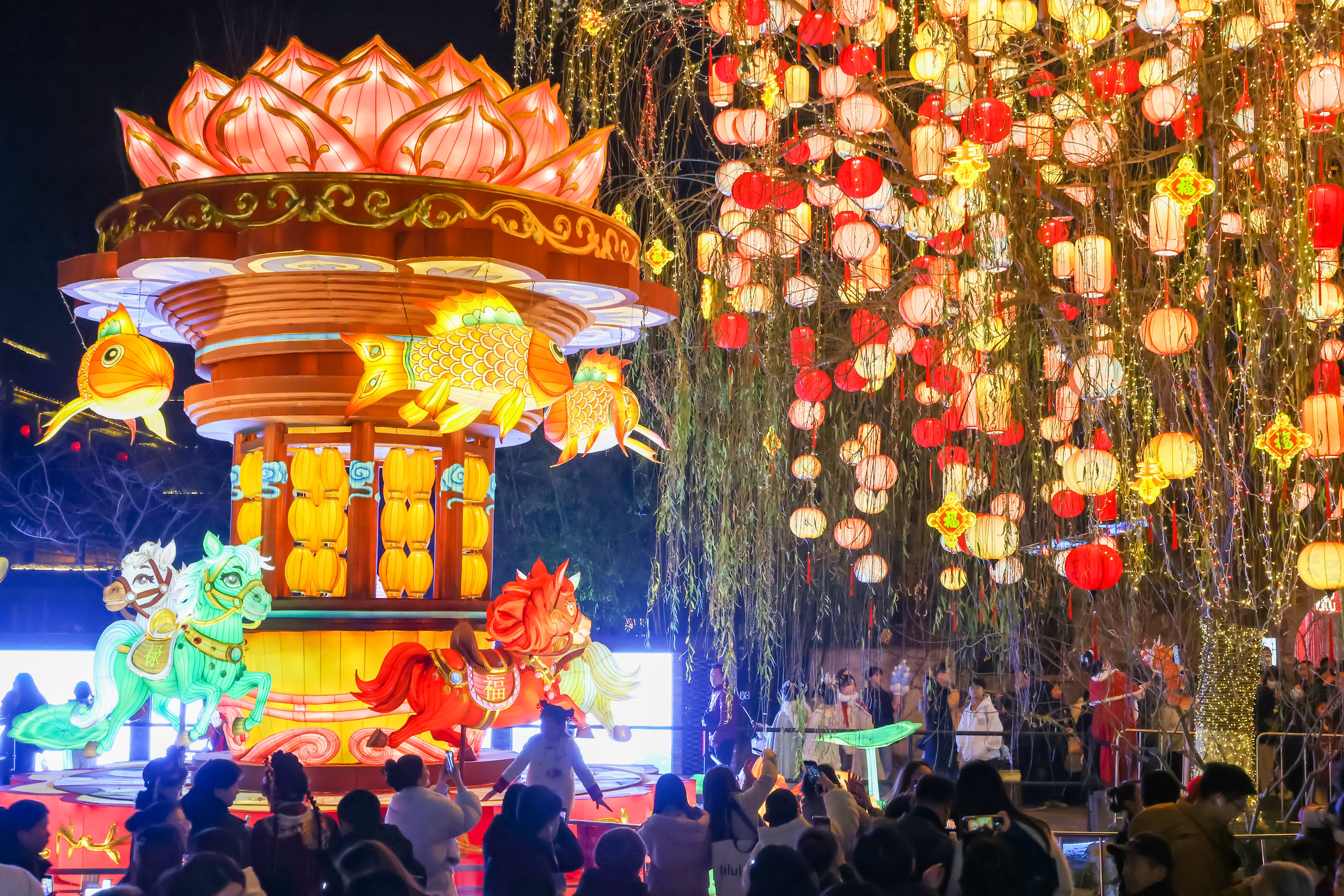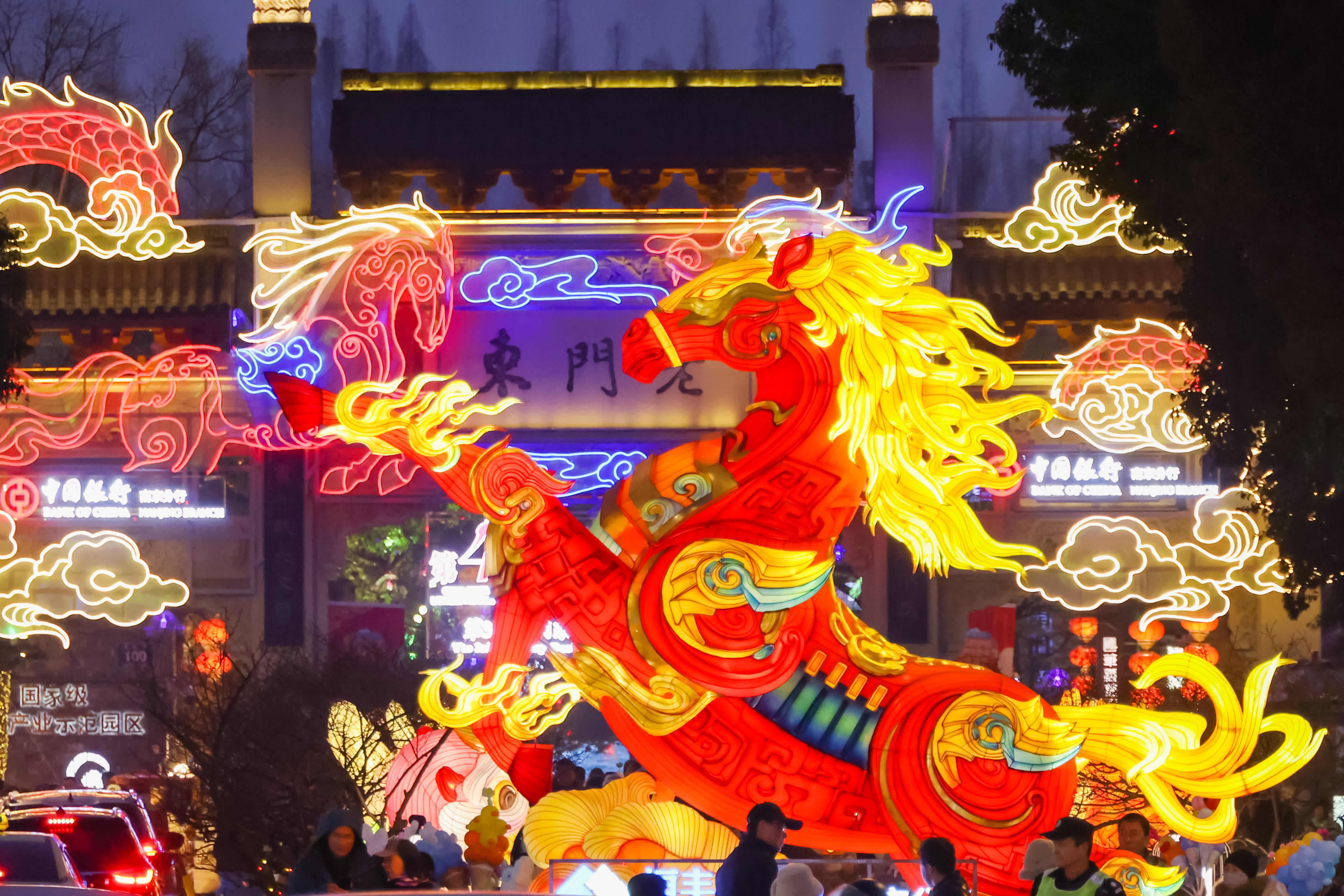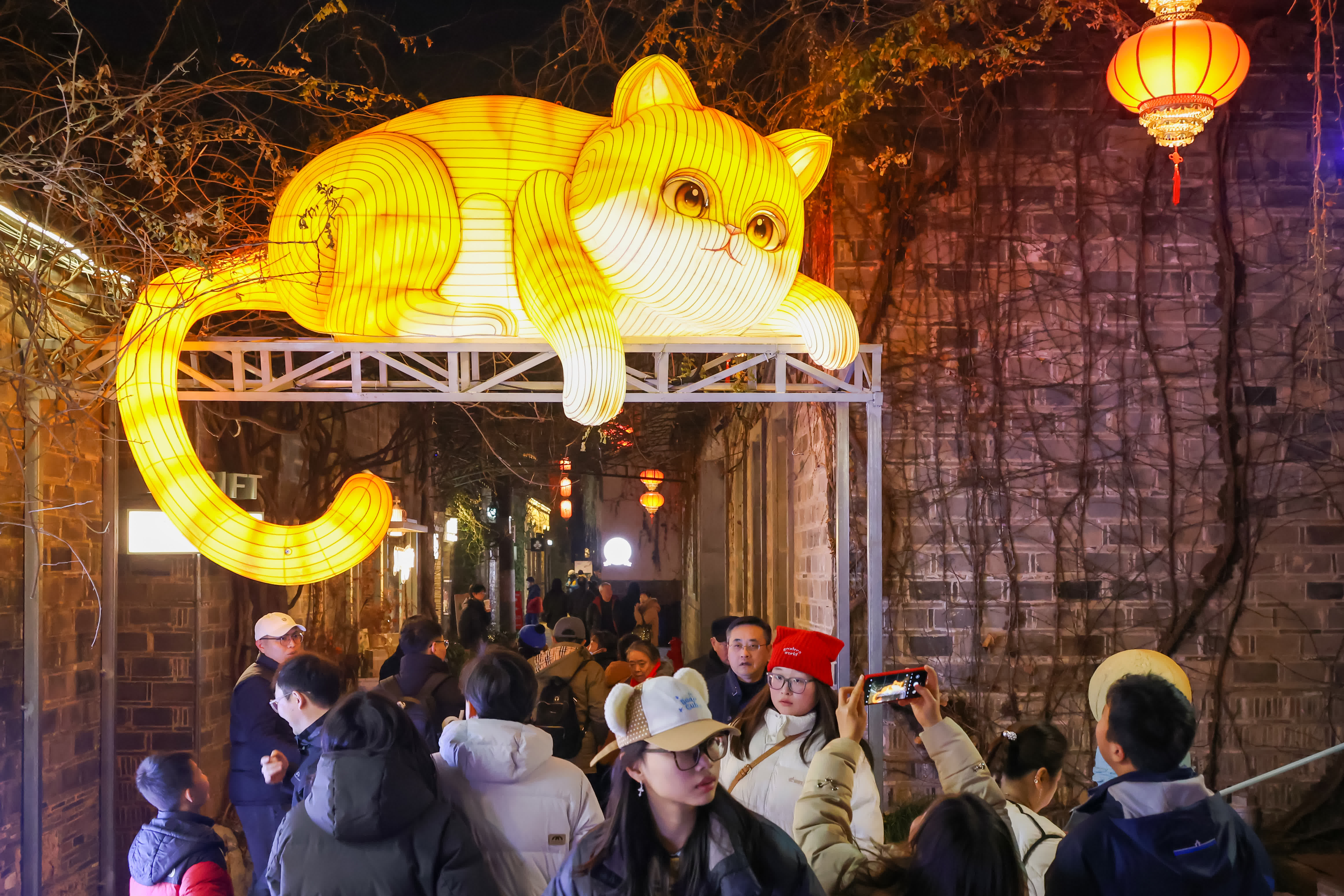 1月28日晚,江蘇南京,市民和遊客在彩燈璀璨的城南老街上遊玩。春節臨近,南京城南街頭巷尾安裝的大型燈組、各式彩燈陸續亮燈,「盛裝打扮」營造節日氛圍。(中新社)