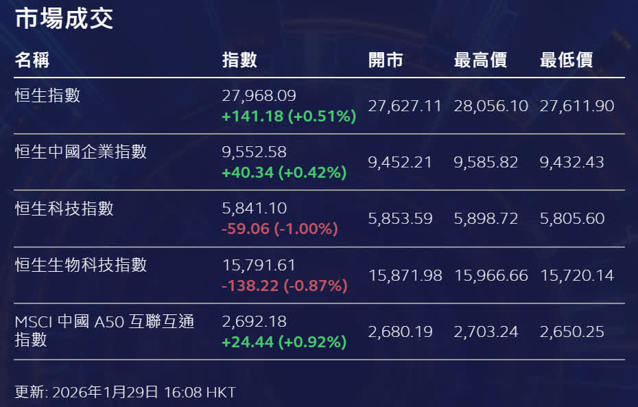 香港文匯報訊 美聯儲如預期維持利率不變,美元指數繼續偏軟,港股交投保持熾熱,惟三大指數表現分化。恒生指數(恒指)收報27,968點,全日升141點或0.51%。國企指數升0.42%。恒生科技指數跌1.00%,表現落後。大市成交約3,320億元。
