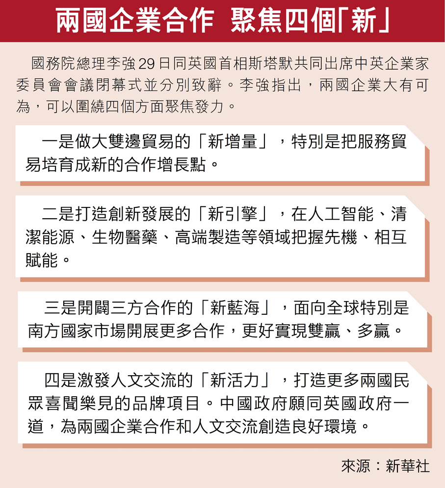 另據新華社報道,29日下午,國務院總理李強在北京人民大會堂同斯塔默舉行會談。李強指出,中方願同英方完善政府間對話合作機制,更加經常性地開展各層級各領域交往。會談後,兩國總理共同見證簽署經貿、農食、媒體、教育、市場監管等領域多項合作文件。